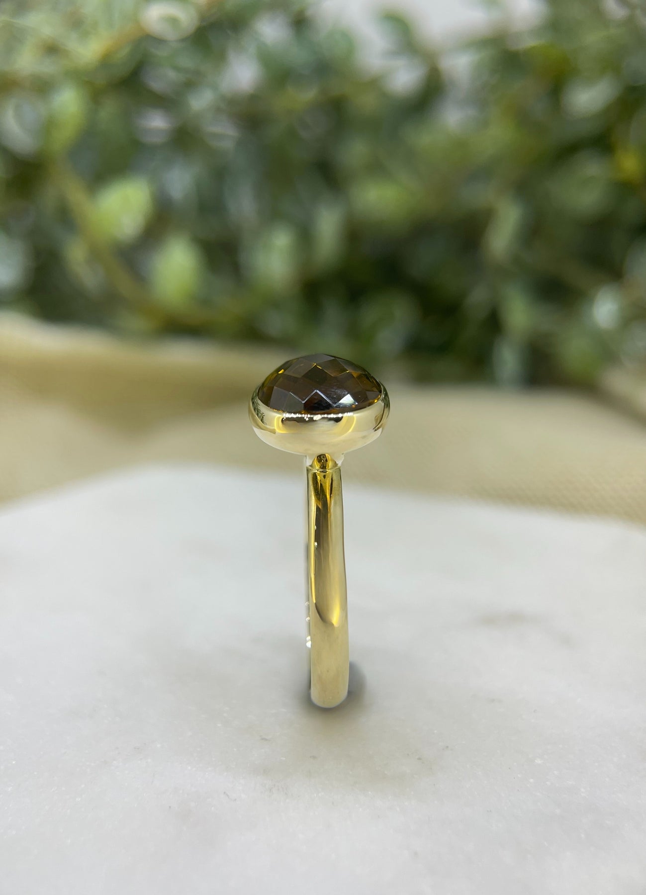 9ct Yellow gold oval checker cut smokey quartz ring bezel set